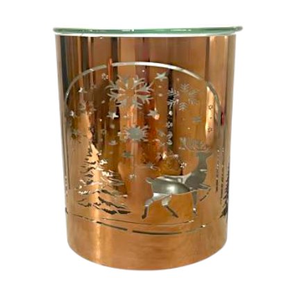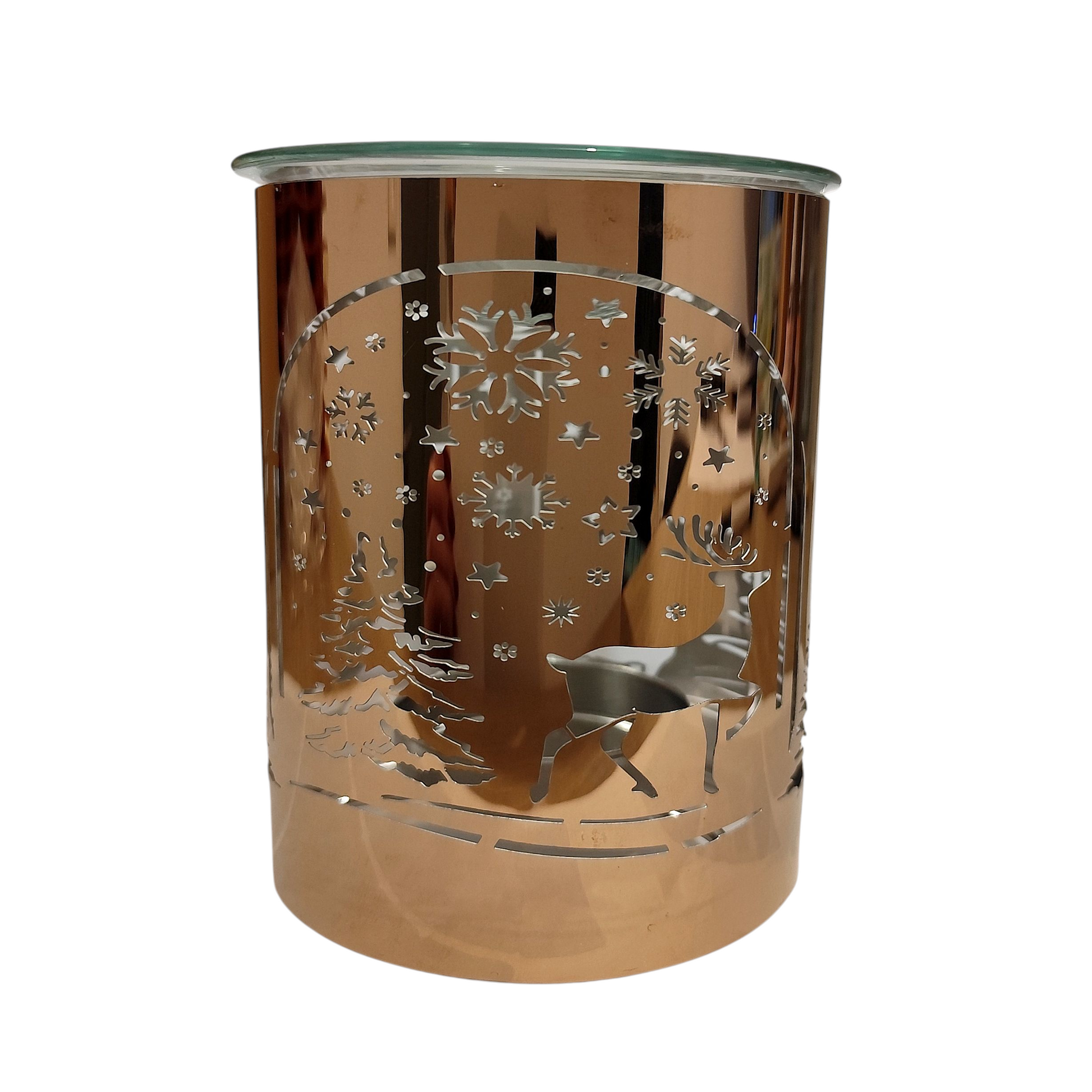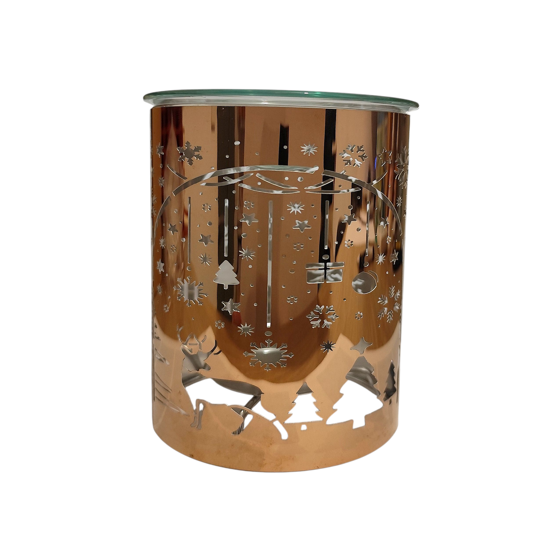 Le brûle-parfum CHRISTMAS en métal cuivré, décoré d’une arche festive, projette un jeu d’ombres féerique : étoiles, rennes, flocons, sapins...