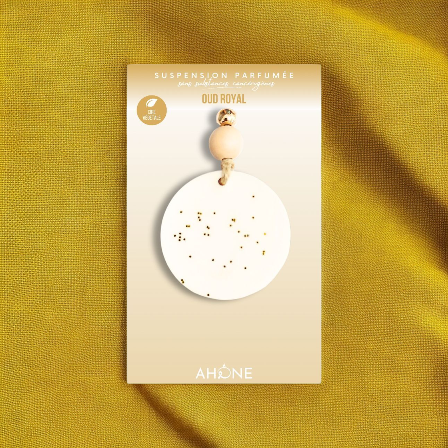 La suspension* parfumée AHONE 'Oud royal' est fabriquée artisanalement dans les Hauts-de-France. Elle est composée de cire végétale de colza sans OGM et de fragrances de Grasse.